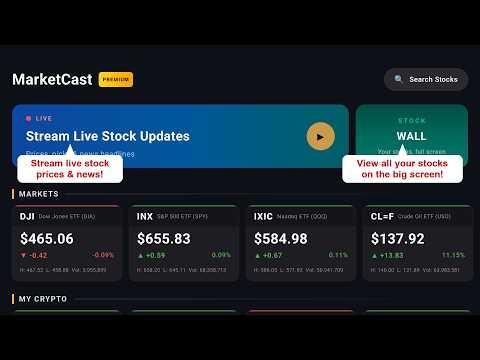 Turn any TV into a professional stock market display. MarketCast is the easiest way to stream live portfolio data in your office, lobby, waiting room, or trading floor — no setup required.