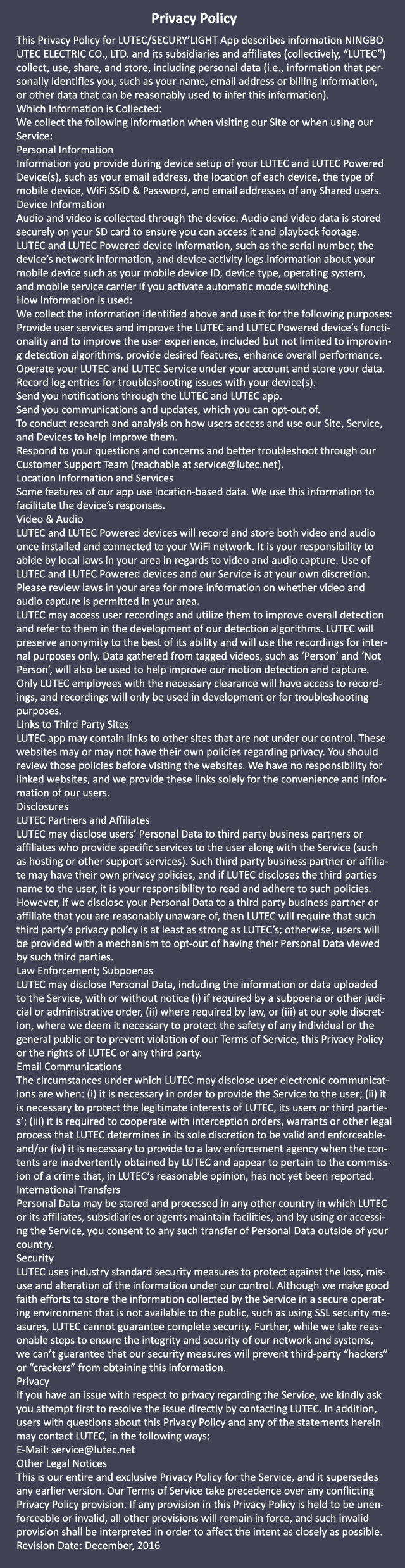 This LUTEC APP is designed for LUTEC SECURY’LIGHT camera systems with LED lights. Once you have connected the app with your device, you can watch the images and videos taken by the camera on your phone or any suitable device and includes two-way voice communication. See who visited your home whenever at anytime from anywhere.